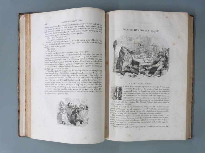 Master Humphrey's Clock by Charles Dickens with illustrations by George Cattermole and Hablot Browne published Chapman and Hall 1840-1841, in 3 volumes first edition bound in half leather marbled boards with gilt ruled bands and lettering on spines