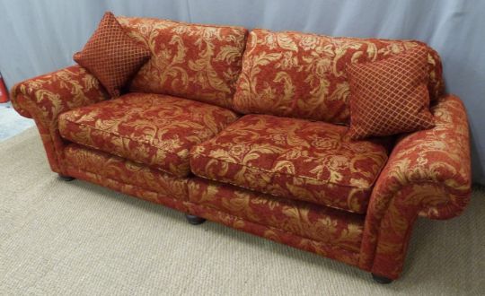 Red and gold upholstered three piece suite