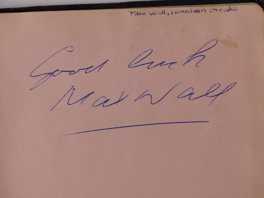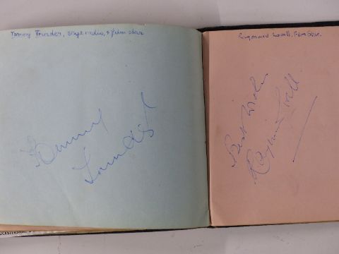 Autograph album containing signatures including Jimmy Edwards, Margaret Lockwood, Dulcie Gray, Susan Shaw, Alec Guinness, Anne Crawford, Arthur English, Nelson Eddy, Frankie Howard, Ted Ray, Peter Ustinov, Bing Crosby, Arthur Askey, Tommy Trinder etc., many being signed photographs