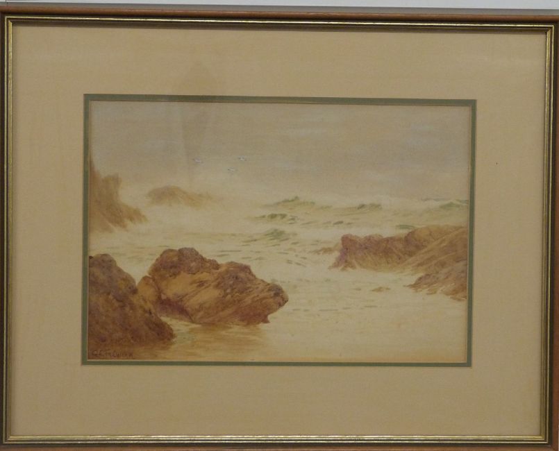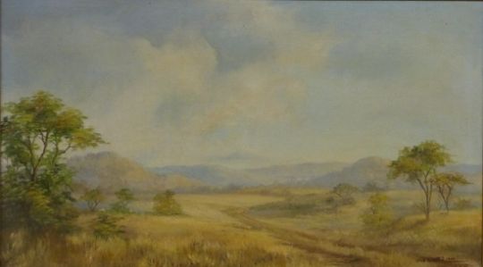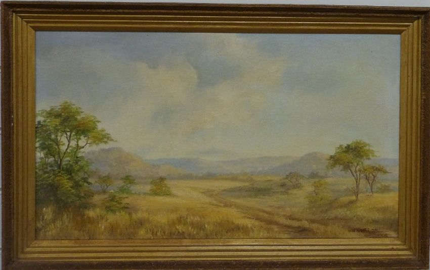 Irene Duggan (b 1936) oil on board of South African / Zimbabwean bush landscape dated 1983, and a watercolour, possibly Cornwall seascape, signed G E Treweek, largest 34 x 58cm