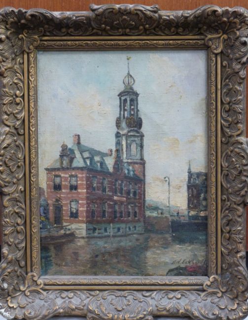 M W Eckhardt oil Continental canal scene, signed lower right, 23x17cm, and an oil on board interior of a church, signed A V Beek, 17 x 23cm