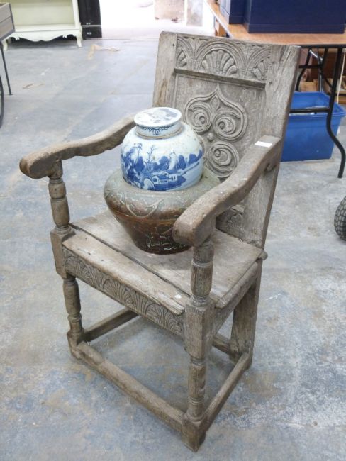 Antique carved oak solid seat chair with peg joints, copper jardiniere and an Oriental ginger jar