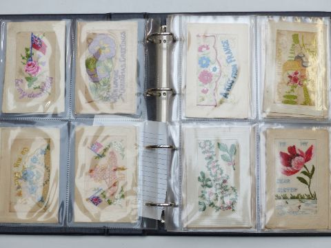 Postcard album containing approximately 50 WWI silk postcards