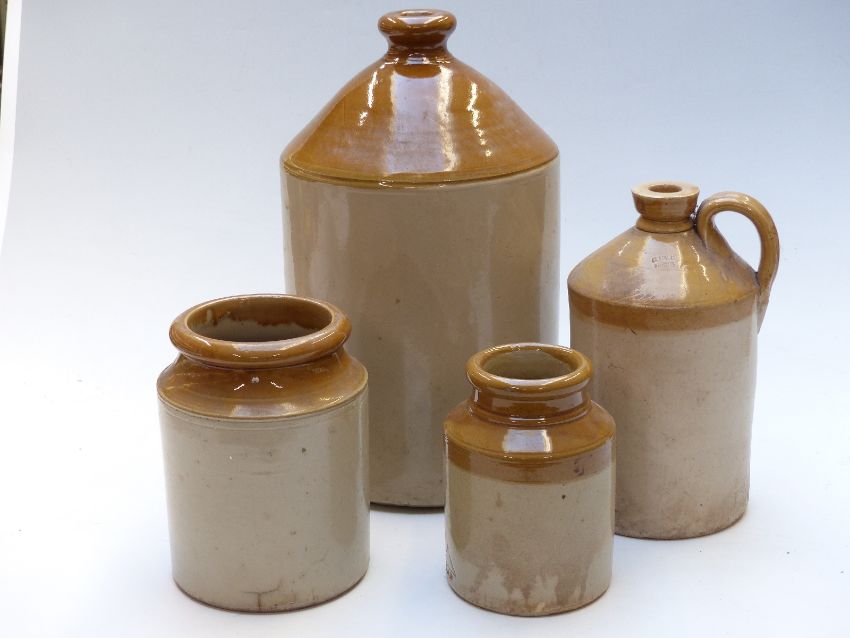 Two stoneware flagons and two jars, tallest 39cm, one impressed G.Hawley, Bristol