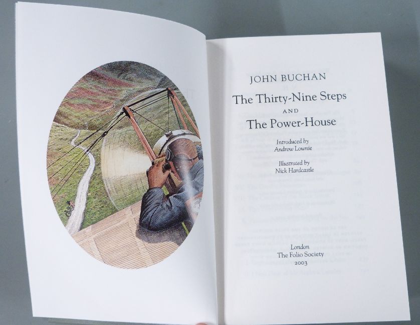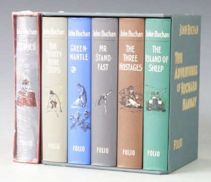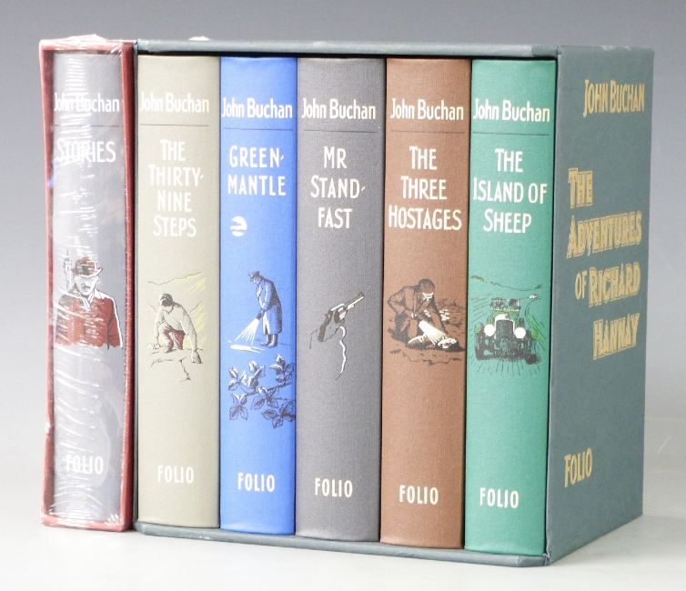 John Buchan, The Novels, The Thirty-Nine Steps, Green-Mantle, Mr. Standfast, The Three Hostages, The Island of Sheep (London, Folio Society, 2003).  Illustrated Nick Hardcastle. Coloured pictorial boards. Green slipcase. 5 volumes. John Buchan, Stories (London, Folio Society, 2003). Grey pictorial cloth in burgundy slipcase. Still shrink wrapped.