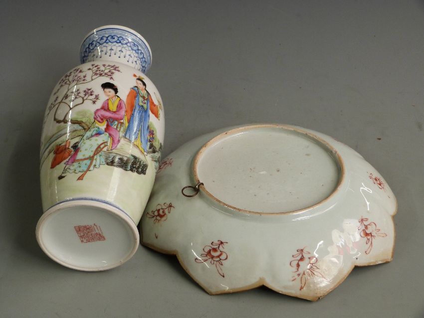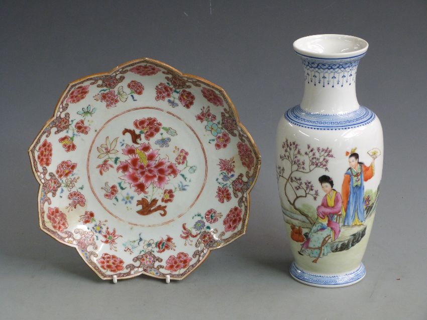 A 19thC Chinese porcelain famille rose plate and a Chinese vase