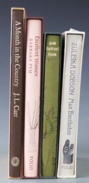 Stella Gibbons, Cold Comfort Farm London, Folio Society, 1977/1999).  Illustrated Quentin Blake.  Green printed cloth.  Green slipcase.  Fine.  Barbara Pym, Excellent Women (London, Folio Society, 2005).  Introduction A. N. Wilson.  Printed and blocked cloth.  Brown slipcase.  J. L. Carr, A Month in the Country (London, Folio Society, 1999.  Introduction Ronald Blythe.  Quarter buckram with printed paper sides.  Brown slipcase.  Max Beerbohm, Zuleika Dobson (London, Folio Society).  Cream boards.  Cream slipcase.  Shrink wrapped.  4 volumes.
