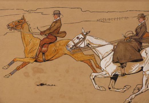 Attributed to Dorothy Hardy in the manner of Cecil Aldin pen and watercolour hunting scene, 27 x 65cm