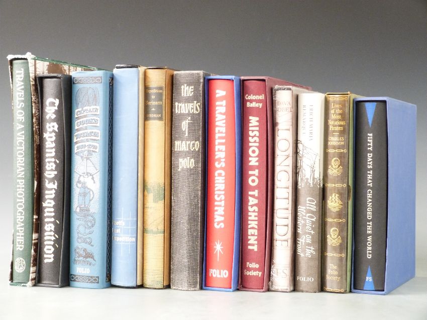 [Travel] Captain Cook’s Voyages 1768-1779 gilt cloth, Travels of Marco Polo, Scott’s Last Expedition, Mission to Tashkent, Longitude, Travels of a Victorian Photographer, other Folio (12)
