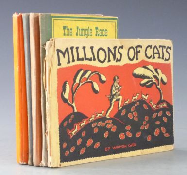 The Story of Babar the Little Elephant by Jean De Brunhoff with a preface by A.A. Milne, Methuen 1936 in colour pictorial boards, with Millions of Cats by Wanda Gag published Coward McCann and three vintage Animal Magic Pop-up books by Bancroft 1967 (Jungle Race, Wizard's Puzzle and Zippy the Parrot)