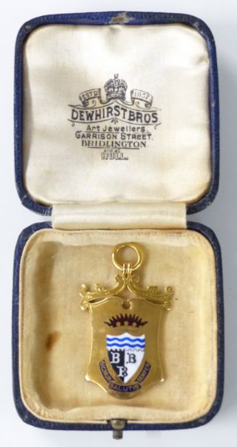 9ct gold and enamel Bridlington fishing medal engraved verso 'Presented to Major Colin Cooper by the Mayor and Corporation for catching the first tunny (tuna) fish landed at Bridlington on 31st August 1936', in Dewhirst Bros, Bridlington jewellery box, weight of medal 7.7g, length including loop 42mm