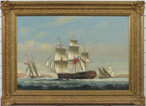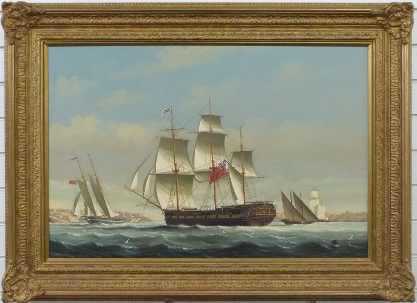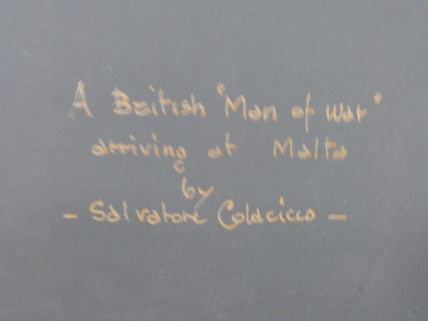 Salvatore Colacilio oil on board a British man of war arriving at Malta with sailing ships in Valetta harbour, signed lower left and also titled verso, in ornate gilt frame, 60 x 90cm