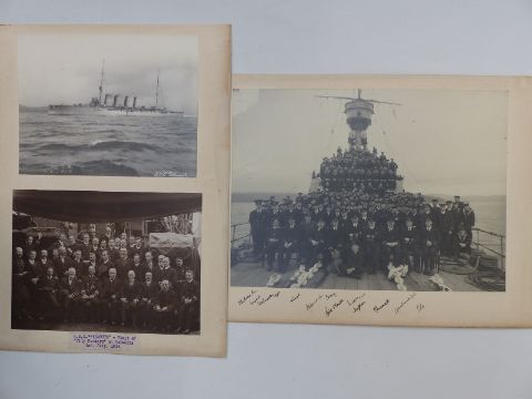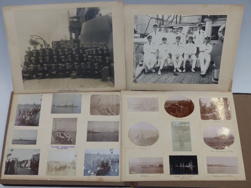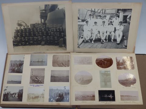 Two postcard/photograph albums of Naval, military, world topographical and historical interest, circa 1914 onwards but mainly 1920s. The first album features multiple pictures of warships, torpedo firing and recovery, HMS Renown, Furious, Repulse and Caledon passing under the Forth Bridge. Further pages entitled “Another War, 1919” referring to Russia including Libau, Baltic Sea, frozen in, Kjobenhavn “our base for the new war”. HMS Inconstant with Camel Pup biplane on deck and mine laying near Dogger Bank 1918.  A further section entitled China 1919-1920 includes Niwrool Sound, Chinghai Fort on the river Yung, Nimrod Sound shooting expedition, Canton, Macao, Hong Kong, sampan village, Pok Fullum, Kowlun (Kowloon), southwards to Lamma Island etc. Further pictures of HMS Thunderer on summer and winter cruises to a variety of places including  Spithead with the King of the Belgians, Loch Leven, Campbeltown, Scapa Flow, Bergen, Madeira, Tenerife, Sardinia, Cap Ferrat, many onshore scenes of rural life included. Views of a variety of places from 1922 include Isle of Wight, Vigo, Mallorca, Tangier, Malta (lots), Cannes, Almeria. New Zealand 1923 including Auckland, Waimarei, Waikato river, Rotorua and Kawasaki, topographical views of New Zealand, Maori people (some large format), untitled Polynesian islands and people, Samoa, Tahiti, Pitcairn, Queenstown etc etc etc. A good section of Lisbon, Malta, bullfighting, Torbay and Spithead reviews 1911, Venice, Corfu, Rhodes etc, approximately 450 images in all.