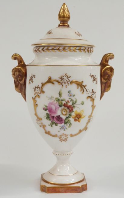 Coalport pedestal covered vase with ram mask handles, hand-decorated with flowers H24cm