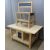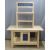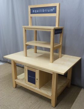 A pine or similar shop display stand with two shelves above the top, the base fitted cupboards and shelf, L137 x W90 x H173cm