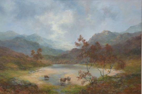 Prudence Turner (b1930) oil on canvas cattle watering in a Highland river valley, signed lower left, 49 x 74cm
