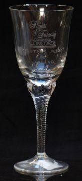 A clear glass wine glass with bowl engraved Flights of Fantasy Goodwood Concorde Christmas Flight To Lapland, raised on twisted stem and conical foot, 17.5cm tall
