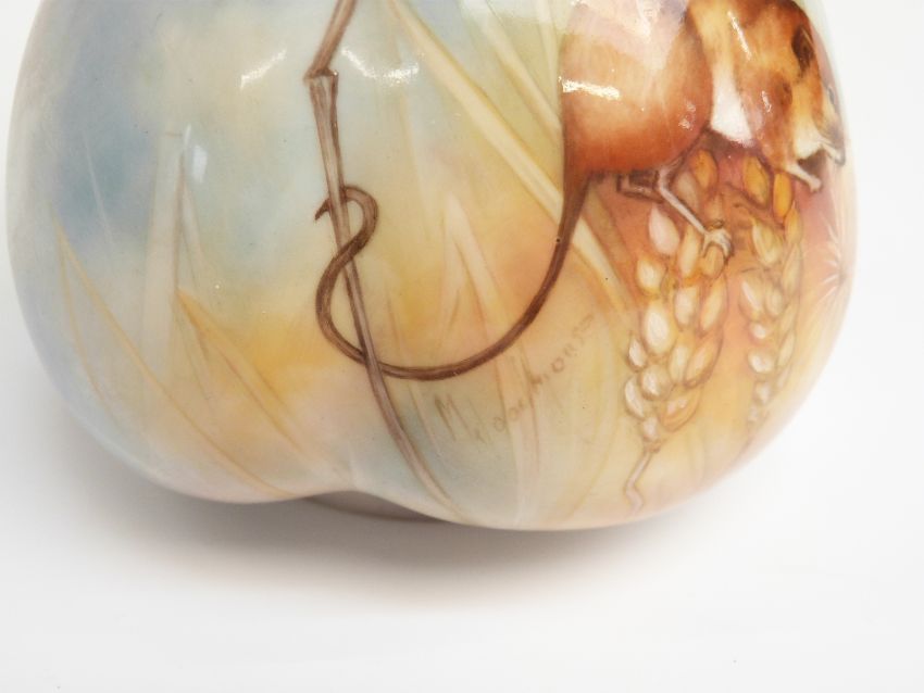 Royal Worcester pedestal twin-handled lobed vase decorated with a dormouse and wheat ears, signed with pseudonym 'Mr Dormouse', puce mark to base, H15.5cm