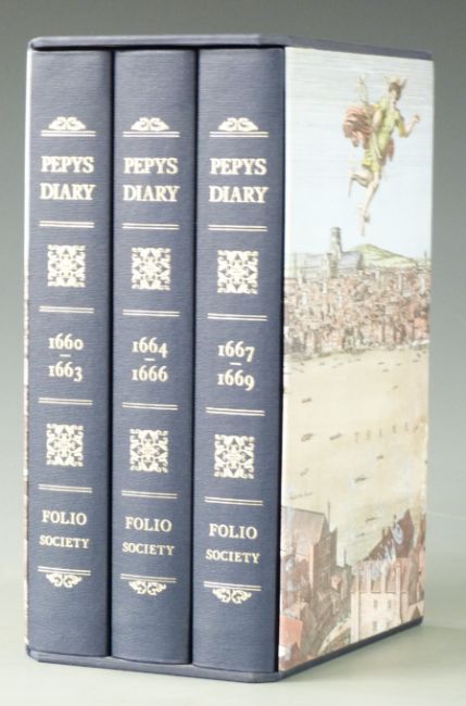 Samuel Pepys, Diaries 1660-1669 (London, Folio Society, 1996), selected and edited Robert Latham.  Blue cloth; 3 volumes. Blue pictorial slipcase.