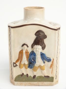 A late 18thC Prattware tea caddy with relief decoration of figures, probably King George III and Queen Caroline with attendants, H12.5cm