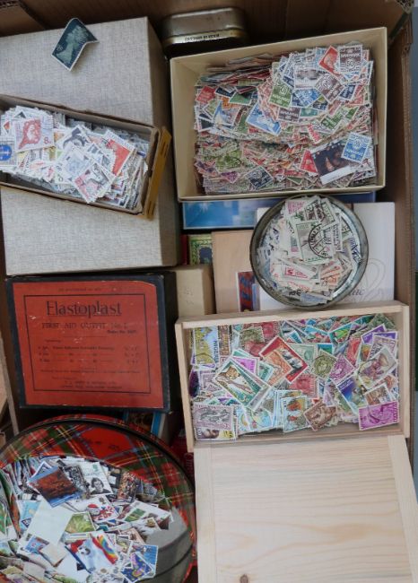 A tray containing a substantial quantity of loose all world stamps in tins, packets etc