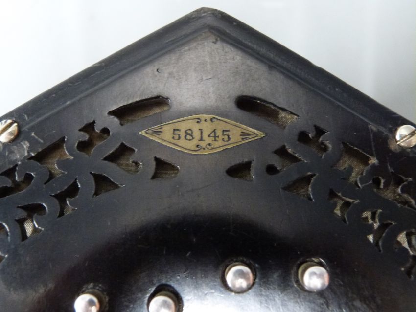 Lachenal and Co. 48 key English system concertina in low pitch, c1925, with metal buttons, ebonised fretworked wooden ends and five fold bellows, reg no. 58145, in original leather carry case