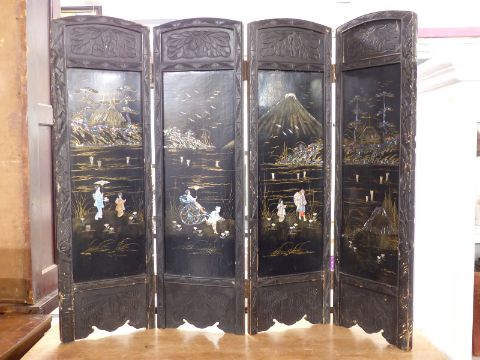 Japanese shibayama four fold screen with mother of pearl and abalone decoration of Mount Fuji, figures etc, W110 x H91cm