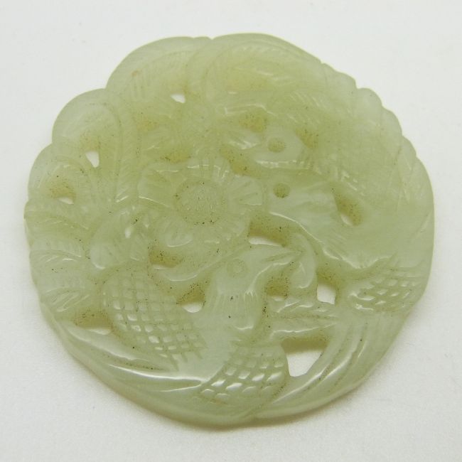 Chinese carved and pierced jade plaque with bird and foliage decoration, diameter 5cm