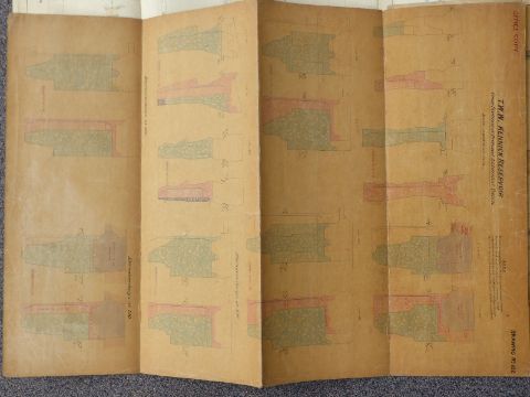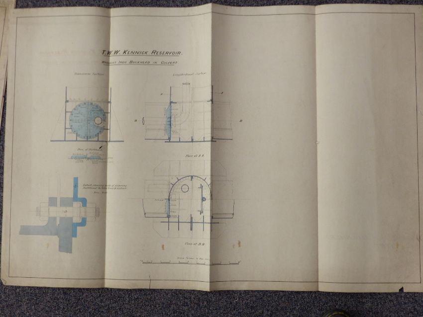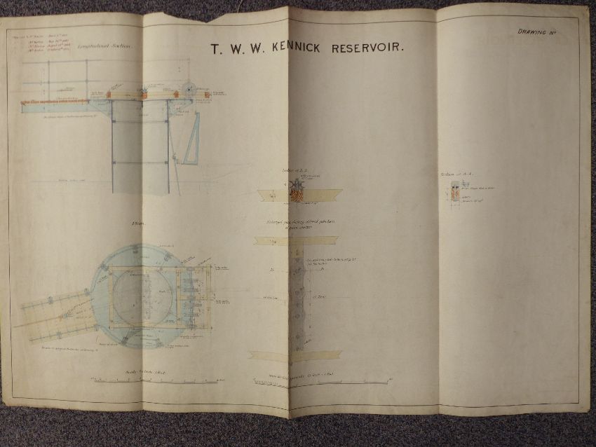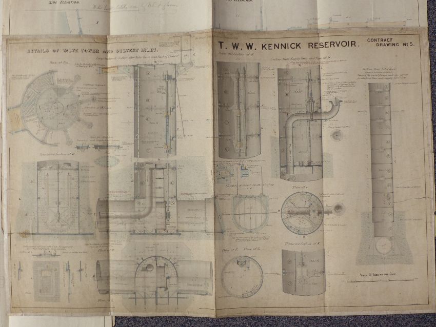 Thirteen early 20th century coloured architectural and engineering drawings relating to Kennick reservoir, Dartmoor, including fitting details, footbridges, valves etc, largest approx 68x101cm
