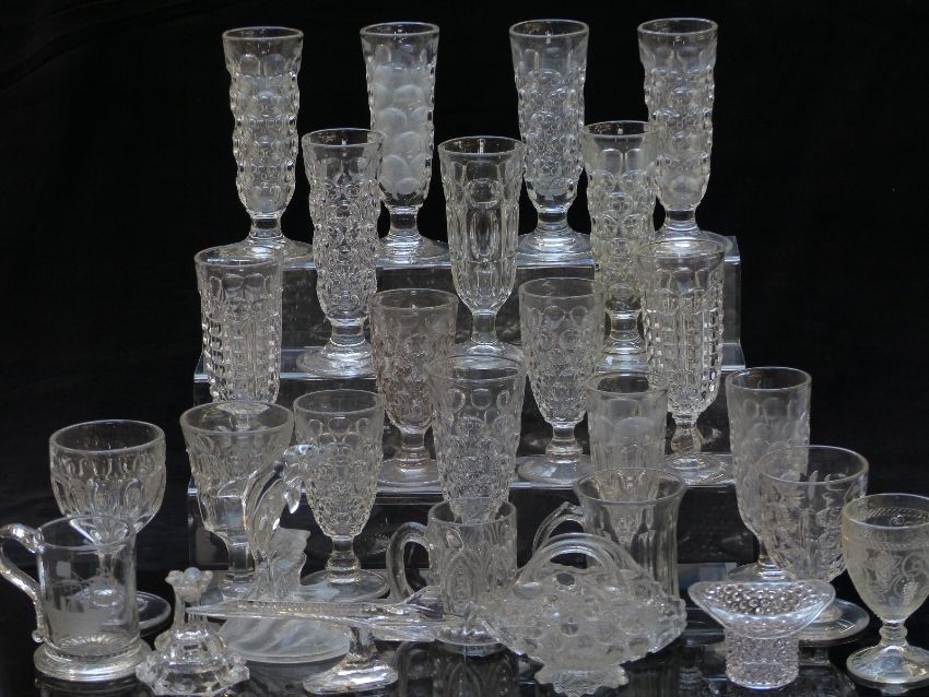 Twenty seven pressed glass vases, goblets and ornaments.