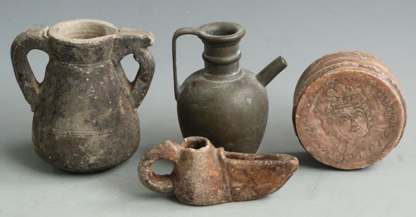 Islamic vessels including oil lamp, carved stone twin-handled pot and a circular stove