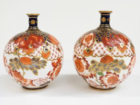 Crown Derby pair of wrythen moulded pedestal spherical vases decorated in Imari design, H13cm
