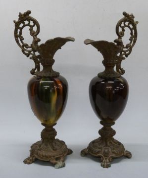 Pair of ceramic dummy ewers/ candlesticks with tiger's eye effect and metal mounts, H36cm