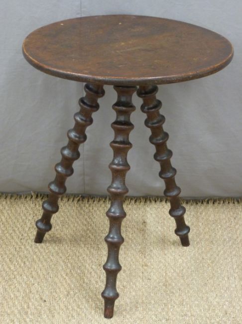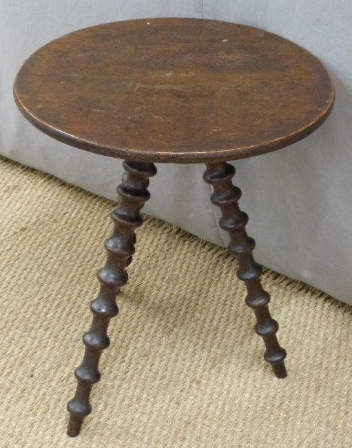 19thC tripod or gypsy table with oak or elm top and bobbin turned legs, diameter 53cm, height 65cm