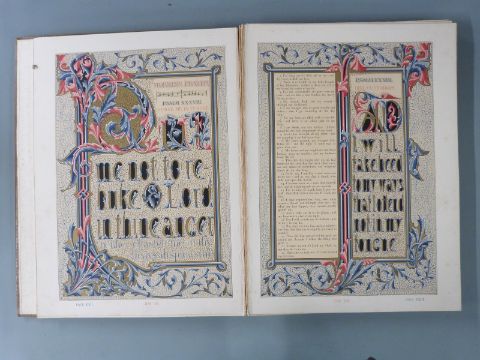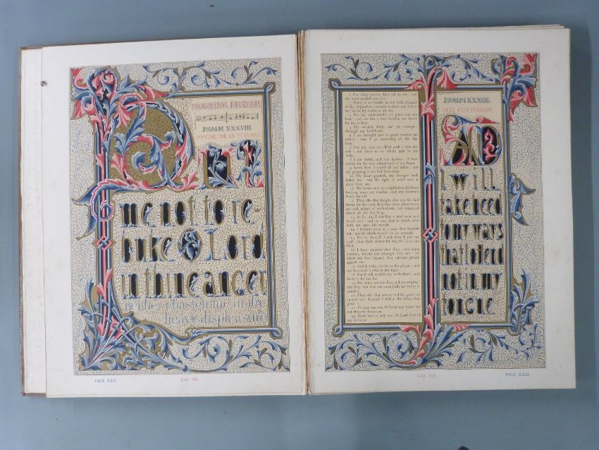 The Psalms of David or Victoria Psalter illuminated by Owen Jones (1861) with chromolithographic plates bound in relief embossed full leather binding and housed in a leather box with gilt mount (gutta-percha perished with contents loose)