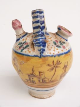 19thC continental Majolica style glazed olive oil pourer/ jar decorated with leaping deer, birds and horses, H14.5cm