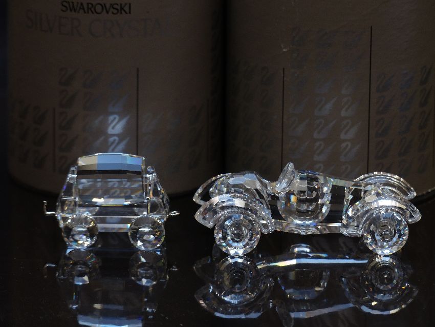 Two Swarovski cut glass vehicles Old Timer Car and Train Tender, both in original boxes with certificates