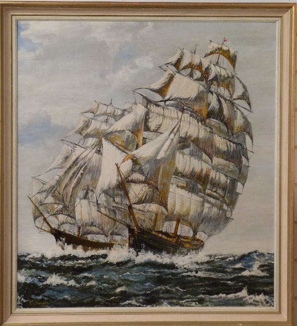 Clive Knight acrylic on board tea clipper race 1866, signed lower left