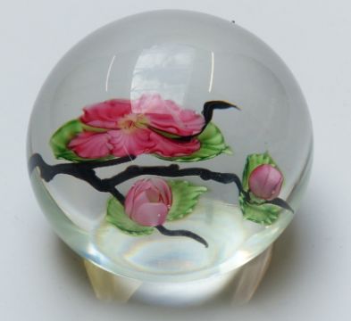 Daniel Salazar for Lundberg Studios glass paperweight with pink prunus blossom decoration, signed and dated 1992, 58mm in diameter.
