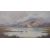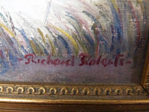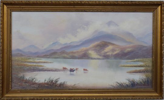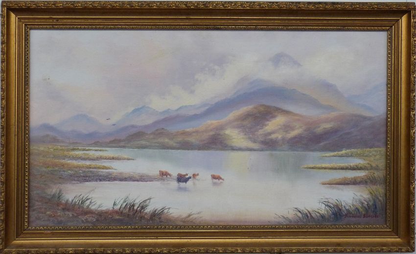 Richard Roberts oil on board Highland cattle watering with mountains beyond, signed lower right, 34 x 62cm