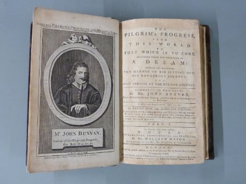 John Bunyan The Pilgrims Progress from This World to That Which is to Come delivered under the similitude of A Dream complete in 2 parts An Entire New and Complete Edition embellished with copperplate engravings, to which are now added Notes by William Mason, printed for Alex Hogg, no date, but inscribed 1795 leather boards professionally re-backed with raised bands, blind stamped panels and gilt lettering with copy of Ovid’s Metamorphoses published 1811 bound in contemporary leather (2)