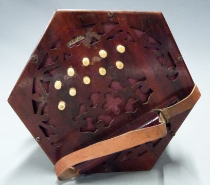 Lachenal and Co Anglo concertina c1910, with rosewood fret worked ends, 21 bone buttons, steel reeds, keys C/G and five fold green bellows, reg no.124558, in original refurbished carry case