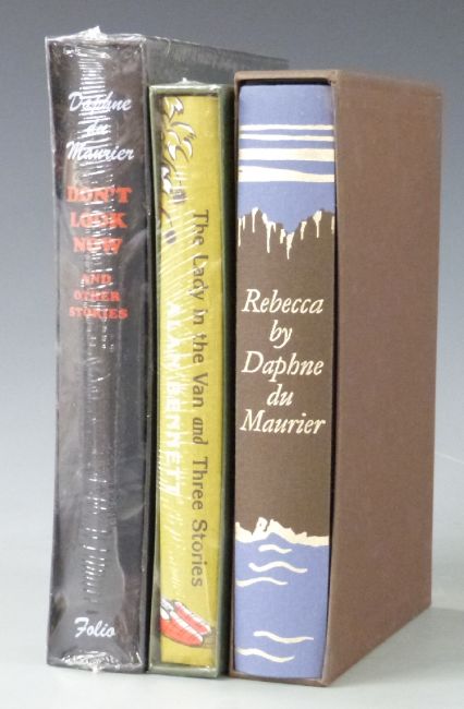 Daphne du Maurier, Rebecca (London, Folio Society, 1999).  Full illustrated cloth.  Brown slipcase.  Fine.  Daphne du Maurier, Don’t Look Now and Other Stories (London, Folio Society).  Black cloth.  Black slipcase.  Shrink wrapped.  Alan Bennett, The Lady in the Van and Three Stories (London, Folio Society).  Green illustrated cloth.  Green slipcase.  Shrink wrapped.  3 volumes