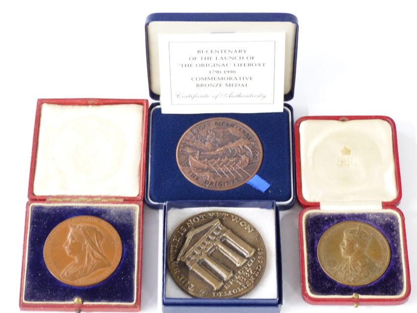 Four cased bronze medal coins to include 1837-1897 Victoria Jubilee, 1911 Coronation medal, Lifeboat launch 1790-1990 Bicentenary by the Royal Mint etc
