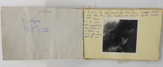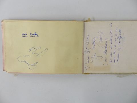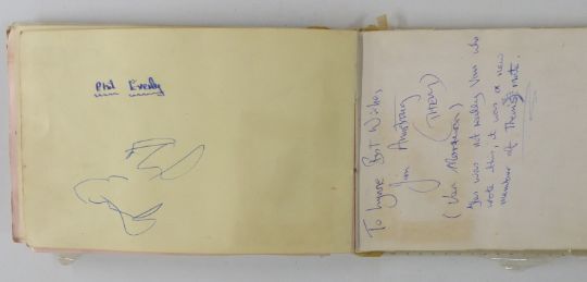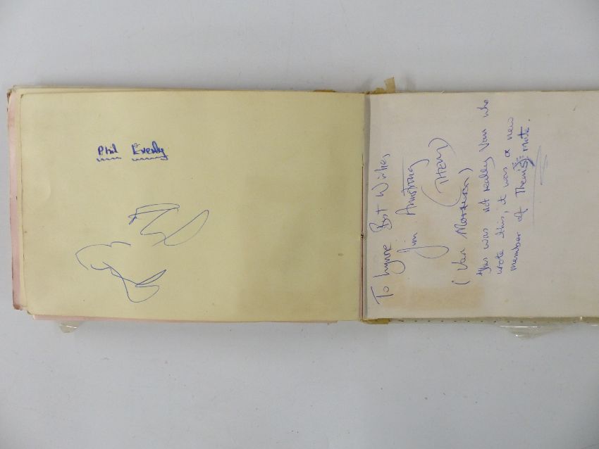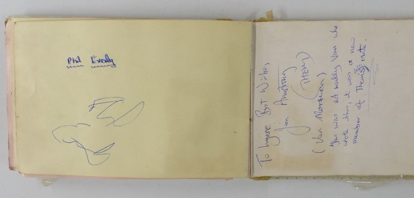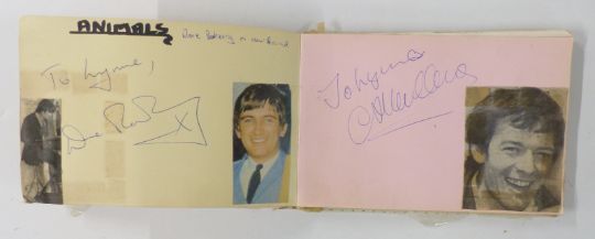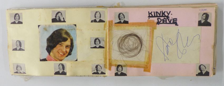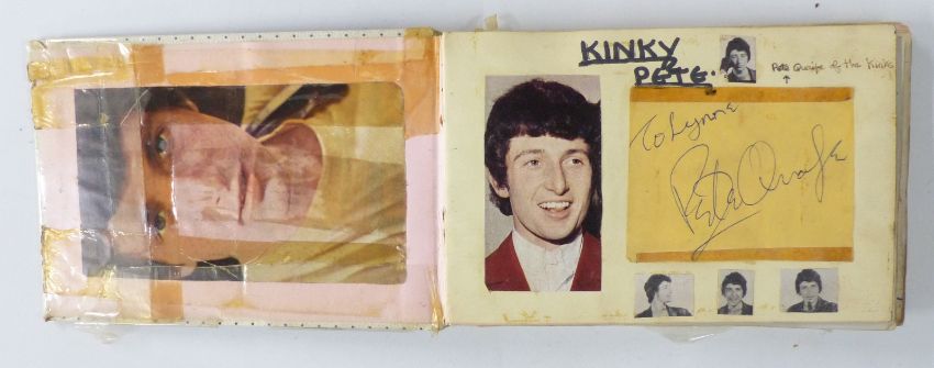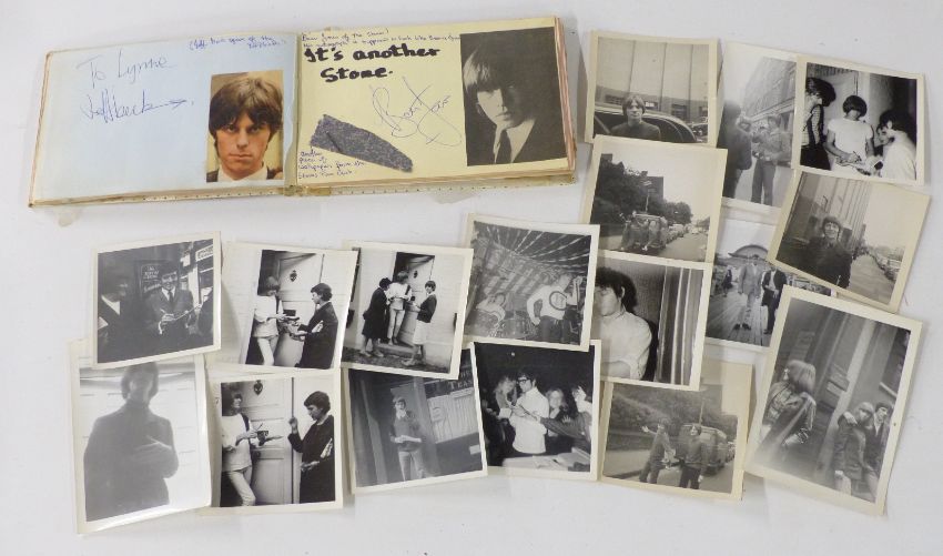Circa 1960's autograph book with signatures including Brian Jones, Phil Everly, Pete Townshend, Jeff Beck and Mitch Mitchell, Pete Quaife, Ray Davies and Dave Davies of the Kinks. Also included is a hair clipping from Dave Davies and grass from his garden, photos of the stars with the vendor and letter of provenance from the vendor giving details of how some of the autographs and the hair were obtained