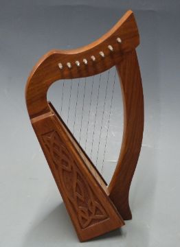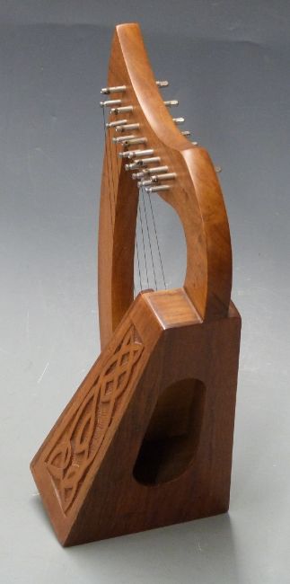 Miniature lap harp with carved Celtic design and eight steel strings, 37cm tall