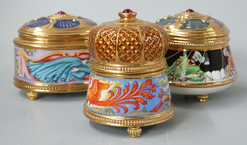 Seven House of Faberge lidded porcelain trinket boxes in original packaging