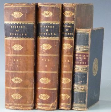 The History of England from the Earliest Period to the end of the Reign of George II by Dr. Goldsmith continued by the Rev. Issac Sloper and Thomas Bartlett, embellished with portraits, published George Virtue in 3 volumes (c1850) bound in full calf with gilt border covers, gilt bands, panel devices and leather title labels on spines, with a copy of Outlines of History by Thomas Keightley in full gilt leather