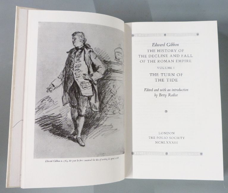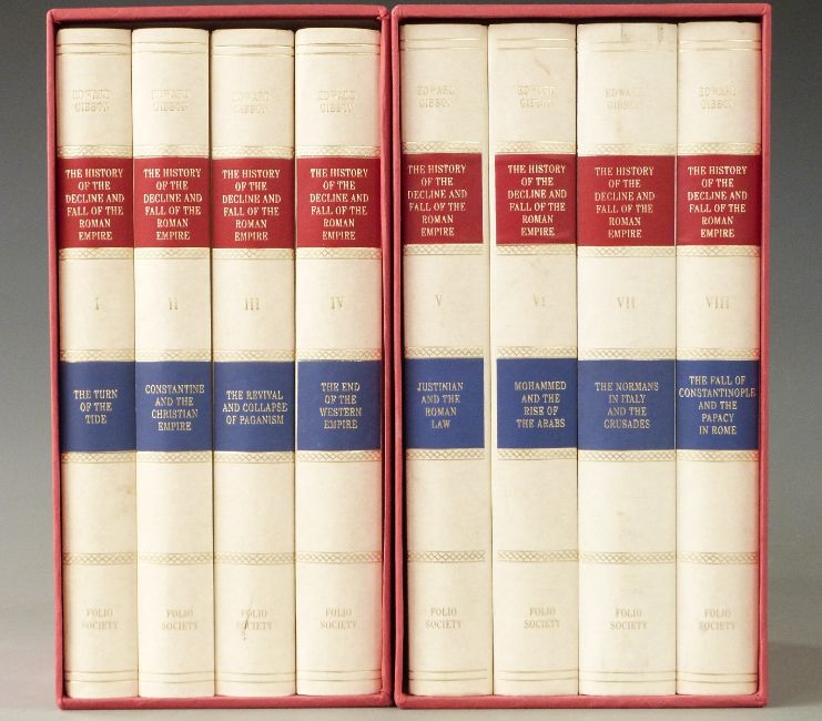 Edward Gibbon, The History of the Decline and Fall of the Roman Empire London, Folio Society, 1983).  Cream banded boards with burgundy and blue labels.  Red slipcases. 8 volumes.