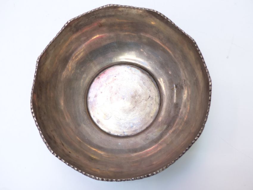 Iranian or similar Middle Eastern white metal bowl with engraved decoration and raised beaded edge, with likely Iranian silver marks to underside, diameter 19cm, weight 420g